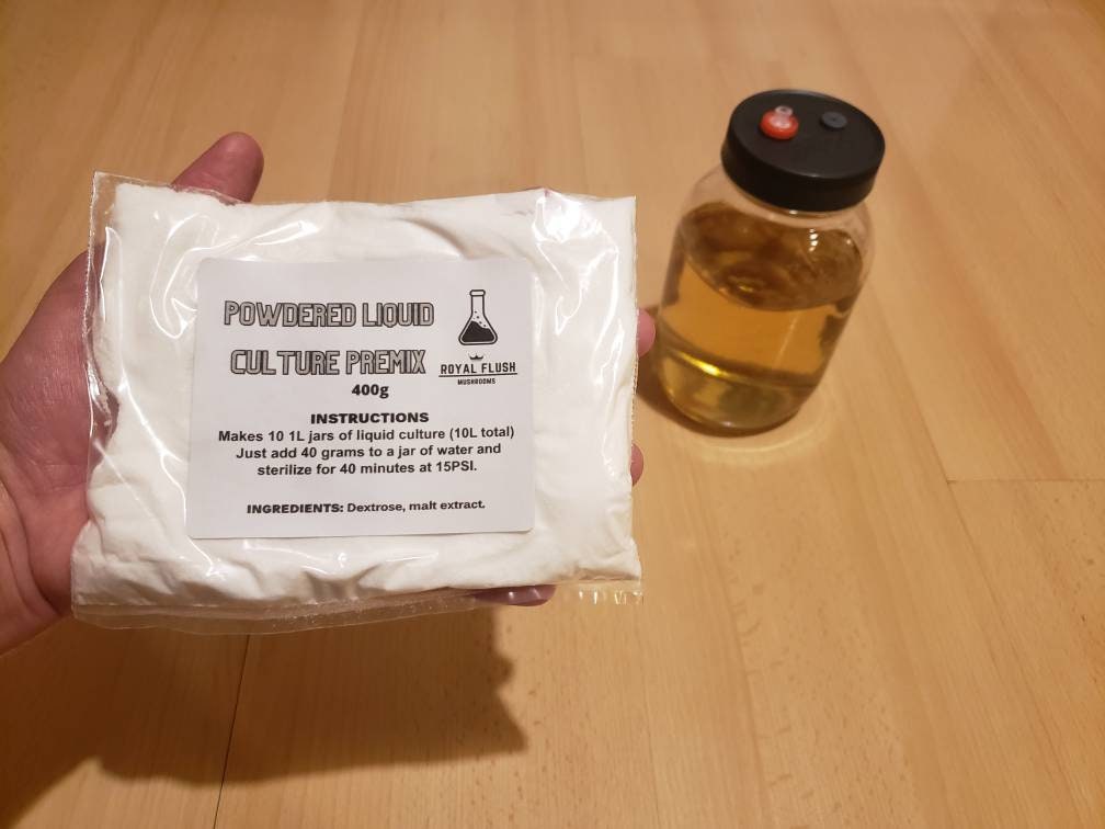 Comes with 400 grams of liquid culture premix, consisting of the perfect ratio of dextrose and malt extract. Just add 40 grams to a jar of water and sterilize for 40 minutes at 15PSI.