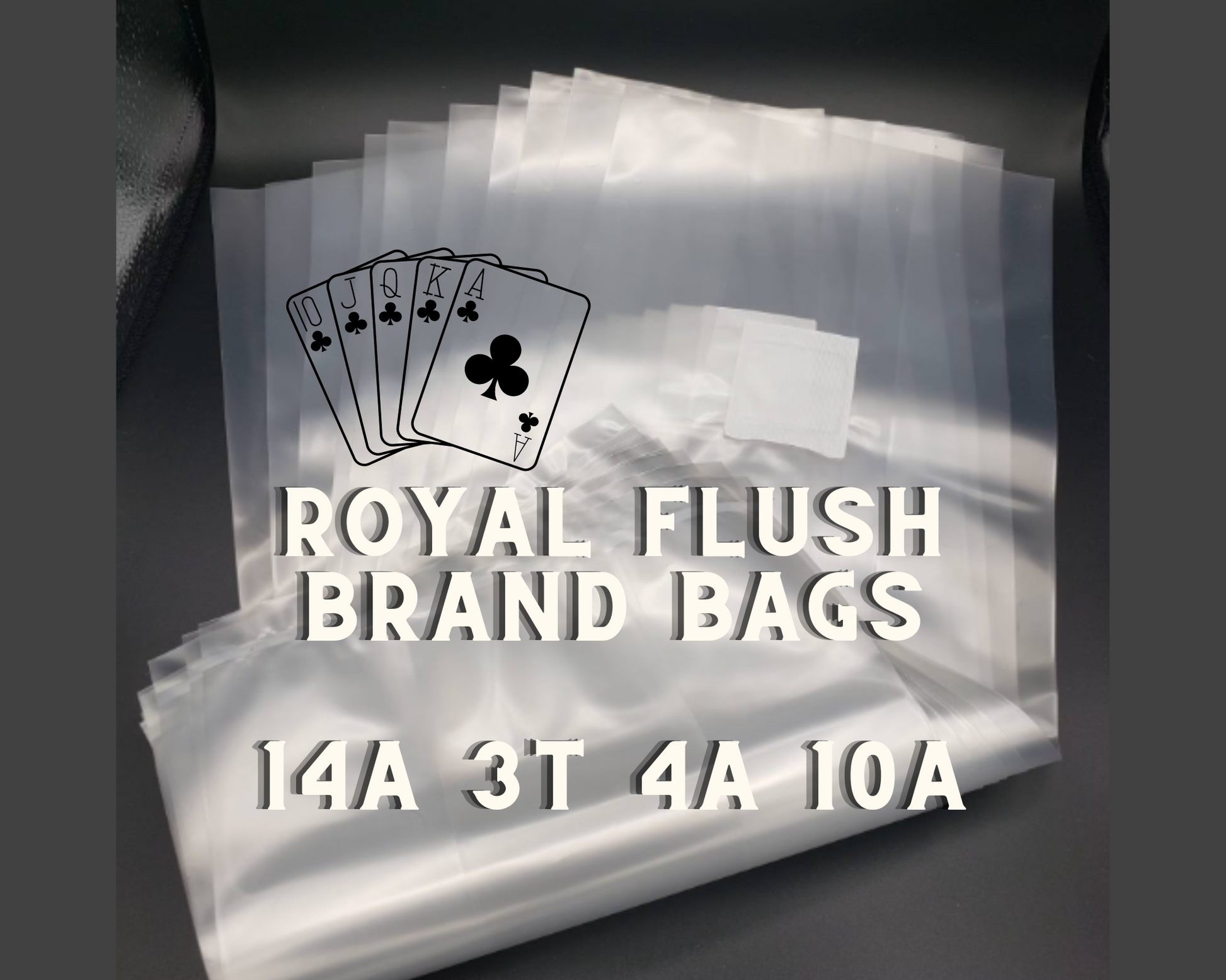 10pcs Royal Flush Brand mushroom grow bags of your choice. Made from polypropylene and able to withstand autoclaving and pressure-cooking. Each bag has a filter to prevent contamination from getting in while also allowing gas exchange. Choose from: 4A, 10A, 14A and 3T